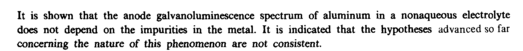 It is shown that the anode galvanoluminescence spectrum of aluminum in a nonaqueous electrolyte does not depend on the impurities in the metal. It is indicated that the hypotheses advanced so far concerning the nature of this phenomenon are not consistent.