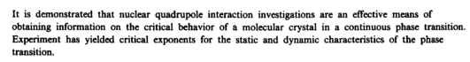 It is demonstrated that nuclear quadrupole interaction investigations are an effective means of obtaining information on the critical behavior of a molecular crystal in a continuous phase transition. Experiment has yielded critical exponents for the static and dynamic characteristics of the phase transition.