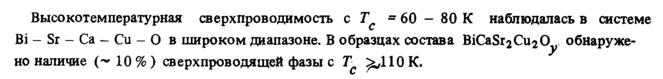 Высокотемпературная сверхпроводимость с Г = 60 80 К наблюдалась в системе ν Bi Sr Са Си О в широком диапазоне. В образцах состава BiCaSr2Cu20y обнаружено наличие (~ 10 % ) сверхпроводящей фазы с Τ ^Д10 К.