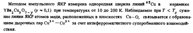 Методом импульсного ЯКР измерена однородная ширина линий Си в керамике YBa Си О (у ** ОД) при температурах от 10 до 200 К. Наблюдаемое при Τ < Τ суже2 Δι у С ние линии ЯКР атомов меди, расположенных в плоскостях Си О, связывается с образованием дырочных пар Си3+ — Си3 + за счет антиферромагнитного суперобменного взаимодействия.