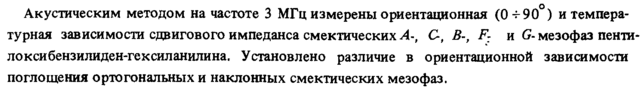 Акустическим методом на частоте 3 МГц измерены ориентационная (0 -г90 ) и температурная зависимости сдвигового импеданса смектических С, В-, F: и Gмезофаз пенти локсибензилиден-гексиланилина. Установлено различие в ориентациоиной зависимости поглощения ортогональных и наклонных смектических мезофаз.