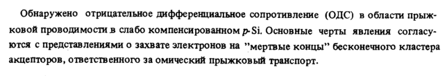 Обнаружено отрицательное дифференциальное сопротивление (ОДС) в области прыжковой проводи мости в слабо компенсированном рSi. Основные черты явления согласуются с представлениями о захвате электронов на "мертвые концы'* бесконечного кластера акцепторов, ответственного за омический прыжковый транспорт.