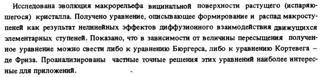 Исследована эволюция макрорельефа вицинальной поверхности растущего (испаряющегося) кристалла. Получено уравнение, описывающее формирование и распад макроступеней как результат нелинейных эффектов диффузионного взаимодействия движущихся элементарных ступеней. Показано, что в зависимости от величины пересыщения полученное уравнение можно свести либо к уравнению Бюргерса, либо к уравнению Кортевега -де Фриза. Проанализированы частные точные решения этих уравнений наиболее интересные для приложений.
