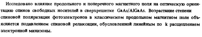 Исследовано влияние продольного и поперечного магнитного поля на оптическую ориентацию спинов свободных носителей в сверхрешетке GaAs/AlGaAs. Возрастание степени спиновой поляризации фотоэлектронов в классическом продольном магнитном поле объясняется подавлением спиновой релаксации, обусловленной линейным по к расщеплением электронной минизоны.