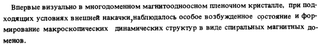 Впервые визуально в многодоменном магнитоодноосном пленочном кристалле, при подходящих условиях внешней накачки?наблюдалось особое возбужденное состояние и формирование макроскопических динамических структур в виде спиральных магнитных доменов.