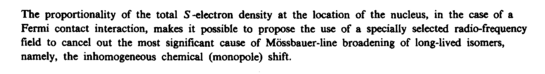 The proportionality of the total 5-electron density at the location of the nucleus, in the case of a Fermi contact interaction, makes it possible to propose the use of a specially selected radio-frequency field to cancel out the most significant cause of Mossbauer-line broadening of long-lived isomers, namely, the inhomogeneous chemical (monopole) shift.