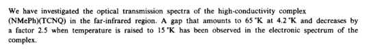 We have investigated the optical transmission spectra of the high-conductivity complex (NMePh)(TCNQ) in the far-infrared region. A gap that amounts to 65 °K at 4.2 °K and decreases by a factor 2.5 when temperature is raised to 15 °K has been observed in the electronic spectrum of the complex.
