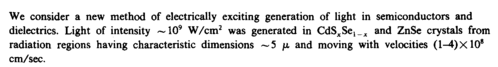 We consider a new method of electrically exciting generation of light in semiconductors and dielectrics. Light of intensity ~109 W/cm2 was generated in CdS^Se^ and ZnSe crystals from radiation regions having characteristic dimensions ~5 μ and moving with velocities (1-4)X108 cm/sec.