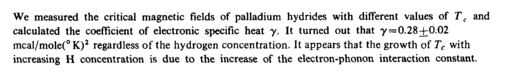 We measured the critical magnetic fields of palladium hydrides with different values of Tc and calculated the coefficient of electronic specific heat y. It turned out that γ=0.284;0.02 mcal/mole(° K)2 regardless of the hydrogen concentration. It appears that the growth of Tc with increasing Η concentration is due to the increase of the electron-phonon interaction constant.
