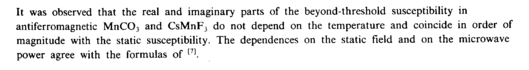 It was observed that the real and imaginary parts of the beyond-threshold susceptibility in antiferromagnetic MnC03 and CsMnF3 do not depend on the temperature and coincide in order of magnitude with the static susceptibility. The dependences on the static field and on the microwave power agree with the formulas of m.
