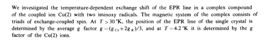 We investigated the temperature-dependent exchange shift of the EPR line in a complex compound of the coupled ion Cu(2) with two iminoxy radicals. The magnetic system of the complex consists of triads of exchange-coupled spin. At Τ > 30 °K, the position of the EPR line of the single crystal is determined by the average g factor g = (gcu + 2gR)/3, and at Γ=4.2°Κ it is determined by the g factor of the Cu(2) ions.