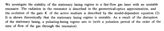 We investigate the stability of the stationary lasing regime in a fast-flow gas laser with an unstable resonator. The radiation in the resonator is described in the geometrical-optics approximation, and the evolution of the gain К of the active medium is described by the model-dependent equation (2). It is shown theoretically that the stationary lasing regime is unstable. As a result of the disruption of the stationary lasing, a pulsating-lasing regime sets in (with a pulsation period of the order of the time of flow of the gas through the resonator).