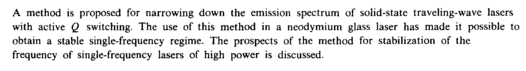 A method is proposed for narrowing down the emission spectrum of solid-state traveling-wave lasers with active Q switching. The use of this method in a neodymium glass laser has made it possible to obtain a stable single-frequency regime. The prospects of the method for stabilization of the frequency of single-frequency lasers of high power is discussed.