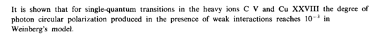 It is shown that for single-quantum transitions in the heavy ions С V and Си XXVIII the degree of photon circular polarization produced in the presence of weak interactions reaches 10~3 in Weinberg's model.