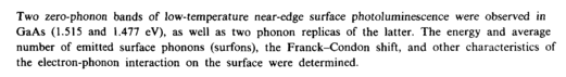 Two zero-phonon bands of low-temperature near-edge surface photoluminescence were observed in GaAs (1.515 and 1.477 eV), as well as two phonon replicas of the latter. The energy and average number of emitted surface phonons (surfons), the Franck-Condon shift, and other characteristics of the electron-phonon interaction on the surface were determined.