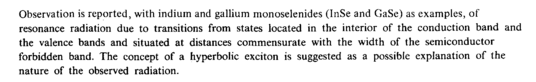 Observation is reported, with indium and gallium monoselenides (InSe and GaSe) as examples, of resonance radiation due to transitions from states located in the interior of the conduction band and the valence bands and situated at distances commensurate with the width of the semiconductor forbidden band. The concept of a hyperbolic exciton is suggested as a possible explanation of the nature of the observed radiation.