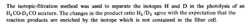 The isotopic-filtration method was used to separate the isotopes Η and D in the photolysis of an H2CO-D2CO mixture. The changes in the product ratio H2/D2 agree with the expectation that the reaction products are enriched by the isotope which is not contained in the filter cell.