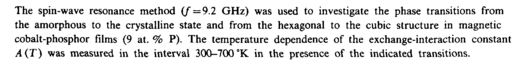 The spin-wave resonance method (f=9.2 GHz) was used to investigate the phase transitions from the amorphous to the crystalline state and from the hexagonal to the cubic structure in magnetic cobalt-phosphor films (9 at. % P). The temperature dependence of the exchange-interaction constant A{T) was measured in the interval 300-700°K in the presence of the indicated transitions.