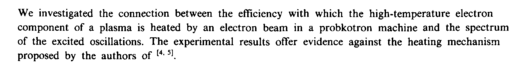 We investigated the connection between the efficiency with which the high-temperature electron component of a plasma is heated by an electron beam in a probkotron machine and the spectrum of the excited oscillations. The experimental results offer evidence against the heating mechanism proposed by the authors of [4·5].