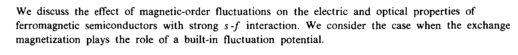 We discuss the effect of magnetic-order fluctuations on the electric and optical properties of ferromagnetic semiconductors with strong s-f interaction. We consider the case when the exchange magnetization plays the role of a built-in fluctuation potential.