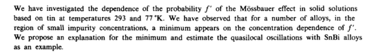 We have investigated the dependence of the probability /' of the Mossbauer effect in solid solutions based on tin at temperatures 293 and 77 °K. We have observed that for a number of alloys, in the region of small impurity concentrations, a minimum appears on the concentration dependence of /'. We propose an explanation for the minimum and estimate the quasilocal oscillations with SnBi alloys as an example.