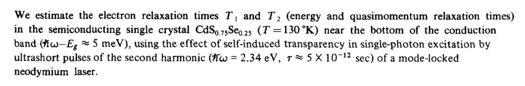 We estimate the electron relaxation times T, and Γ2 (energy and quasimomentum relaxation times) in the semiconducting single crystal CdSojsSe^s (Г = 130°К) near the bottom of the conduction band {ϋω-Eg = 5 meV), using the effect of self-induced transparency in single-photon excitation by ultrashort pulses of the second harmonic (/Τω = 2.34 eV, τ * 5 Χ 10~12 sec) of a mode-locked neodymium laser.