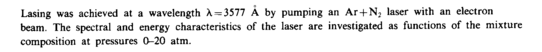 Lasing was achieved at a wavelength λ = 3577 A by pumping an Ar + N2 laser with an electron beam. The spectral and energy characteristics of the laser are investigated as functions of the mixture composition at pressures 0-20 atm.
