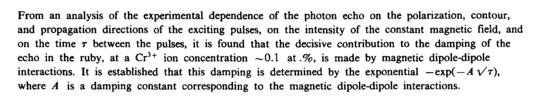 From an analysis of the experimental dependence of the photon echo on the polarization, contour, and propagation directions of the exciting pulses, on the intensity of the constant magnetic field, and on the time τ between the pulses, it is found that the decisive contribution to the damping of the echo in the ruby, at a Cr3+ ion concentration ~0.1 at.%, is made by magnetic dipole-dipole interactions. It is established that this damping is determined by the exponential — exp(—A Vt), where A is a damping constant corresponding to the magnetic dipole-dipole interactions.