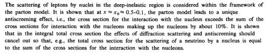 The scattering of leptons by nuclei in the deep-inelastic region is considered within the framework of the parton model. It is shown that at χ = x0«< 0.5-0.1, the parton model leads to a unique antiscreening effect, i.e., the cross section for the interaction with the nucleus exceeds the sum of the cross sections for interaction with the nucleons making up the nucleons by about 10%. It is shown that in the integral total cross section the effects of diffraction scattering and antiscreening should cancel out so that, e.g., the total cross section for the scattering of a neutrino by a nucleus is equal to the sum of the cross sections for the interaction with the nucleons.