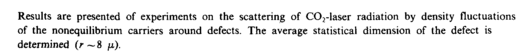 Results are presented of experiments on the scattering of COrlaser radiation by density fluctuations of the nonequilibrium carriers around defects. The average statistical dimension of the defect is determined (r ~8 μ).