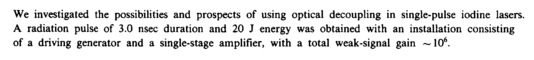We investigated the possibilities and prospects of using optical decoupling in single-pulse iodine lasers. A radiation pulse of 3.0 nsec duration and 20 J energy was obtained with an installation consisting of a driving generator and a single-stage amplifier, with a total weak-signal gain ~ 106.