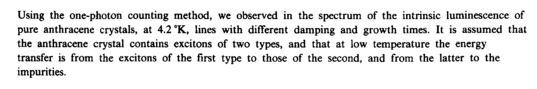 Using the one-photon counting method, we observed in the spectrum of the intrinsic luminescence of pure anthracene crystals, at 4.2 °K, lines with different damping and growth times. It is assumed that the anthracene crystal contains excitons of two types, and that at low temperature the energy transfer is from the excitons of the first type to those of the second, and from the latter to the impurities.