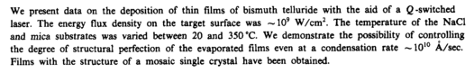 We present data on the deposition of thin films of bismuth telluride with the aid of a Q-switched laser. The energy flux density on the target surface was ~109 W/cm2. The temperature of the NaCl and mica substrates was varied between 20 and 350 °C. We demonstrate the possibility of controlling the degree of structural perfection of the evaporated films even at a condensation rate ~1010 A/sec. Films with the structure of a mosaic single crystal have been obtained.