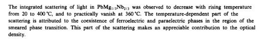 The integrated scattering of light in PbMg1,3Nb2/3 was observed to decrease with rising temperature from 20 to 400 °C, and to practically vanish at 360 °C. The temperature-dependent part of the scattering is attributed to the coexistence of ferroelectric and paraelectric phases in the region of the smeared phase transition. This part of the scattering makes an appreciable contribution to the optical density.