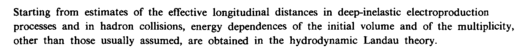 Starting from estimates of the effective longitudinal distances in deep-inelastic electroproduction processes and in hadron collisions, energy dependences of the initial volume and of the multiplicity, other than those usually assumed, are obtained in the hydrodynamic Landau theory.