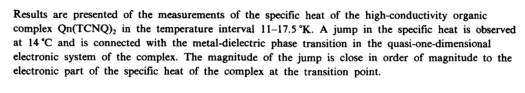 Results are presented of the measurements of the specific heat of the high-conductivity organic complex Qn(TCNQ)2 in the temperature interval 11-17.5 °K. A jump in the specific heat is observed at 14 °C and is connected with the metal-dielectric phase transition in the quasi-one-dimensional electronic system of the complex. The magnitude of the jump is close in order of magnitude to the electronic part of the specific heat of the complex at the transition point.