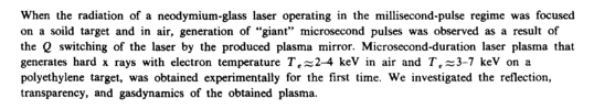 When the radiation of a neodymium-glass laser operating in the millisecond-pulse regime was focused on a soild target and in air, generation of "giant" microsecond pulses was observed as a result of the Q switching of the laser by the produced plasma mirror. Microsecond-duration laser plasma that generates hard χ rays with electron temperature Τ e 2-4 keV in air and Τ e =; 3-7 keV on a polyethylene target, was obtained experimentally for the first time. We investigated the reflection, transparency, and gasdynamics of the obtained plasma.