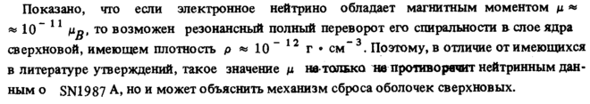 Показано, что если электронное нейтрино обладает магнитным моментом μ * » 10" 11 μβ, то возможен резонансный полный переворот его спиральности в слое ядра сверхновой, имеющем плотность ρ « 10 ~ 12 г · см" 3, Поэтому, в отличие от имеющихся в литературе утверждений, такое значение μ не только не противоречит нейтринным данным о SN1987 А»но и может объяснить механизм сброса оболочек сверхновых.