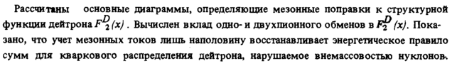 Рассчитаны основные диаграммы, определяющие мезонные поправки к структурной функции дейтронаF^(x) . Вычислен вклад однои двухтонного обменов вЯр(х). Показано, что учет мезонных токов лишь наполовину восстанавливает энергетическое правило сумм для кв ар ков ого распределения дейтрона, нарушаемое в немассовостью нуклонов-.