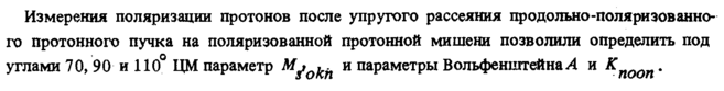 Измерения поляризации протонов после упругого рассеяния продольно-поляризованного протонного пучка на поляризованной протонной мишени позволили определить под углами 70, 90 и ПО ЦМ параметр ^ и параметры ВольфенштеЙна А и Кпооп.