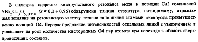 В спектрах ядерного квадрупольного резонанса меди в позиции Си2 соединений YBa Си О Λ (х = 0,0 -г 0,95) обнаружена тонкая структура, по-видимому, отражаю2 3 6,0 + X щая влияние на резонансную частоту степени заполнения атомами кислорода преимущественно позиций 04л Перераспределение интенсивностей отдельных линий с увеличением X указывает на рост количества кислородных О4 пар атомов при переходе в область сверхпроводящих составов.