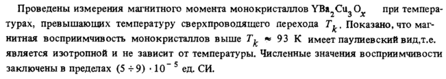 Проведены измерения магнитного момента монокристаллов ΥΒ*2Οΐ3Οχ при температурах, превышающих температуру сверхпроводящего перехода Т^, Показано, что магнитная восприимчивость монокристаллов выше * 93 К имеет паулиевский видд.е. является изотропной и не зависит от температуры. Численные значения восприимчивости заключены в пределах (5 -г 9) -10" 5 ед. СИ.