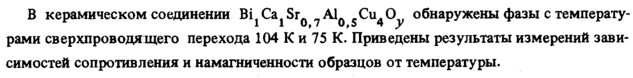 В керамическом соединении BijCajSi^ ?А10 $Си40^ обнаружены фазы с температурами сверхпроводящего перехода 104 К и 75 К. Приведены результаты измерений зависимостей сопротивления и намагниченности образцов от температуры.