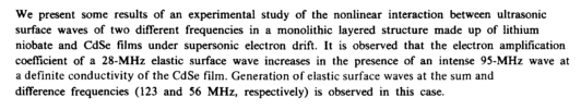 We present some results of an experimental study of the nonlinear interaction between ultrasonic surface waves of two different frequencies in a monolithic layered structure made up of lithium niobate and CdSe films under supersonic electron drift. It is observed that the electron amplification coefficient of a 28-MHz elastic surface wave increases in the presence of an intense 95-MHz wave at a definite conductivity of the CdSe film. Generation of elastic surface waves at the sum and difference frequencies (123 and 56 MHz, respectively) is observed in this case.
