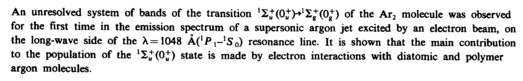 An unresolved system of bands of the transition ιΣ*(0+}*ί1,*φ+) of the Ar2 molecule was observed for the first time in the emission spectrum of a supersonic argon jet excited by an electron beam, on the long-wave side of the λ=1048 k(}Pi-S0) resonance line. It is shown that the main contribution to the population of the 'Σ+(0+) state is made by electron interactions with diatomic and polymer argon molecules.