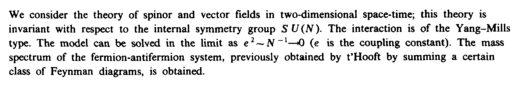 We consider the theory of spinor and vector fields in two-dimensional space-time; this theory is invariant with respect to the internal symmetry group SU(N). The interaction is of the Yang-Mills type. The model can be solved in the limit as e2~iV"'—Ю (e is the coupling constant). The mass spectrum of the fermion-antifermion system, previously obtained by t'Hooft by summing a certain class of Feynman diagrams, is obtained.