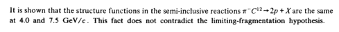 It is shown that the structure functions in the semi-inclusive reactions π Cl2-*2p + are the same at 4.0 and 7.5 GeV/c. This fact does not contradict the limiting-fragmentation hypothesis.