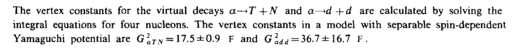 The vertex constants for the virtual decays α—>T +N and a—>d -\-d are calculated by solving the integral equations for four nucleons. The vertex constants in a model with separable spin-dependent Yamaguchi potential are G 2aTy — 17.5 ±0.9 F and G 2add = 36.7 ± 16.7 F.