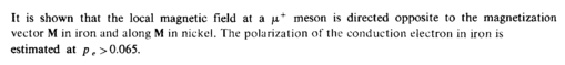 It is shown that the local magnetic field at a μ+ meson is directed opposite to the magnetization vector Μ in iron and along Μ in nickel. The polarization of the conduction electron in iron is estimated at ρ e > 0.065.