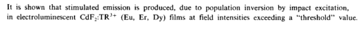 It is shown that stimulated emission is produced, due to population inversion by impact excitation, in electroluminescent CdF2:TR3+ (Eu, Er, Dy) films at field intensities exceeding a "threshold" value.